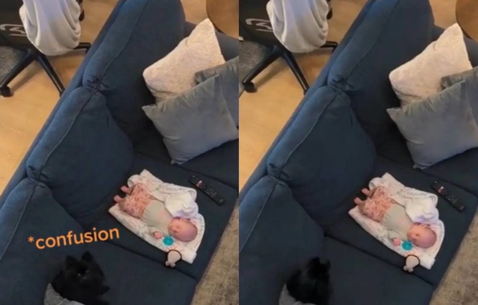 Он бросил ребёнку игрушку и ждал, когда малыш кинет ее в ответ. Жаль только, пушок слишком рано начал играть с малюткой, ведь тот еще совсем крошечный младенец. Ну ничего, когда он подрастёт, будет играть с пушистым днями напролёт.