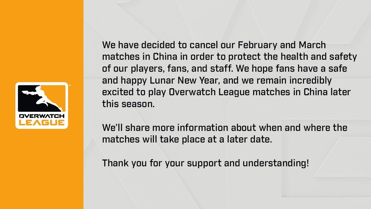 Мы решили отменить наши февральские и мартовские матчи в Китае, чтобы защитить здоровье и безопасность наших игроков, болельщиков и персонала. Мы надеемся, что у фанатов будет безопасный и счастливый лунный Новый год, и мы по-прежнему будем невероятно рады сыграть в Китае в этом сезоне в Лиге "Overwatch", — объявила Blizzard.