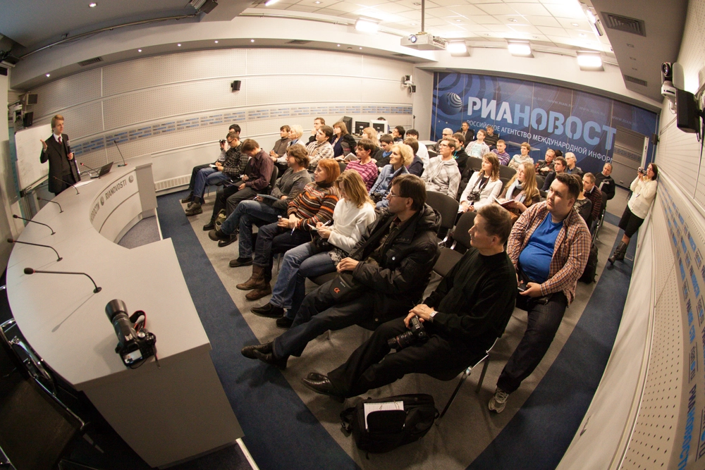 Из предыдущего текста вам наверное уже стало ясно, что РИА Новости не ограничивалось территорией РФ и горяченький, ценный контент получало со всей планеты. Хотя, конечно же, в основном в проекте ТЫ-Репортёр участвовали жители РФ, десяток активных журналистов в Москве, и несколько десятков по регионам России. Однажды самых лучших даже пригласили в Москву, на экспресс-обучение азам журналистики и новогодний корпоратив, замаскированный, правда, под "Презентацию новых мультимедийных технологий" (ну не может же госконтора арендовав огромный зал жрать водку за гос.счёт, ей богу). Камеры на корпоратив рекомендовали с собой не брать, так что воспользуюсь фотоработой коллеги, который протащил на событие мыльницу.