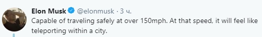 «Можно безопасно путешествовать со скоростью более 150 миль (240 км) в час. На такой скорости это будет похоже на телепортацию», — написал бизнесмен в комментарии к своему посту в Twitter.