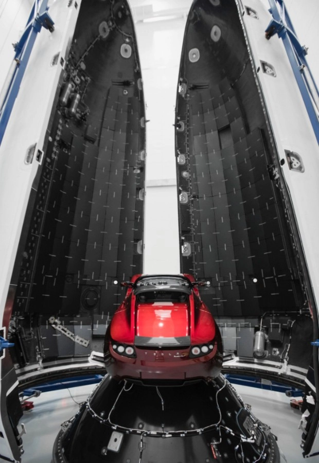 Как видно на снимках, Tesla установлена диагонально, а по сторонам от нее находятся панели обтекателя. Электрокар будет выполнять роль полезной нагрузки; масса Tesla Roadster составляет 1,3 тонны.