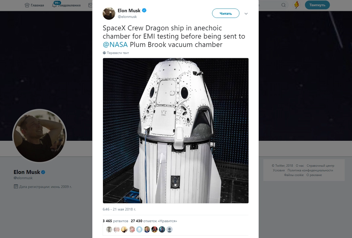 На фотографии Маска изображена новая капсула, которую в данный момент тестируют в безэховой камере для изучения электромагнитной совместимости. Инженеры объясняют, что такие проверки нужны для того, чтобы убедиться в исправности электрической системы.