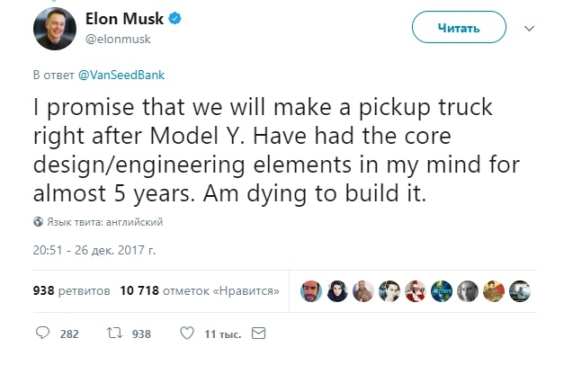 Глава компании Tesla заявил, что уже давно намерен выпустить подобный автомобиль, но пока что этот проект остается на уровне идеи. Изобретатель пояснил, что он планирует серьезно заняться разработкой электропикапа уже после выхода новой Tesla Y.