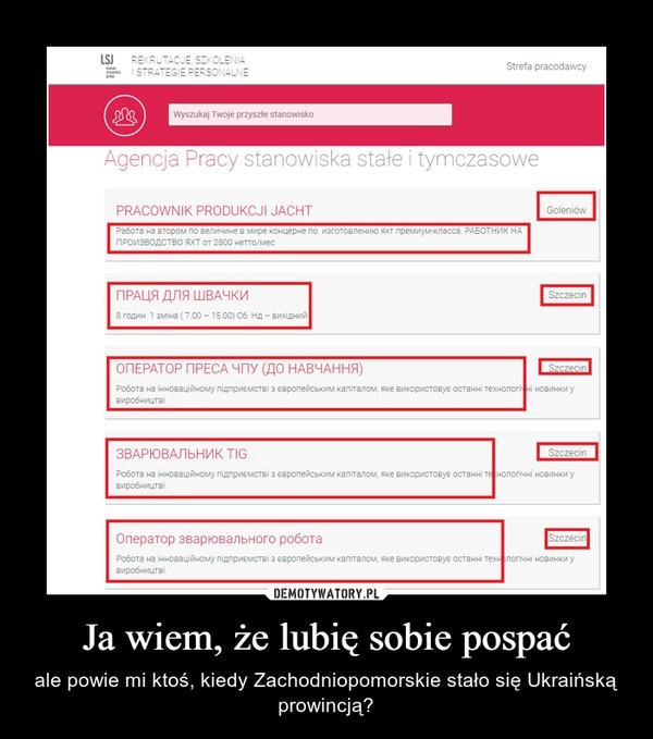 Демотиватор: «Я знаю, что люблю поспать, но скажет мне кто-нибудь, когда Западно-Поморское воеводство стало украинской провинцией?» (Поляки недовольны засильем объявлений о приеме на работу, написанных на украинском языке.)