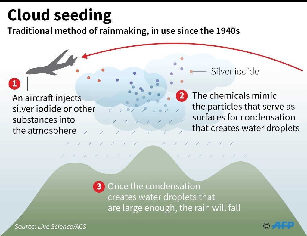 Сейчас местные власти направили десятки тысяч человек и несколько десятков бомбардировочных самолетов, которые благодаря популярной технологии засеивания облаков вызовут дожди. Такая технология часто используется в засушливых регионах.