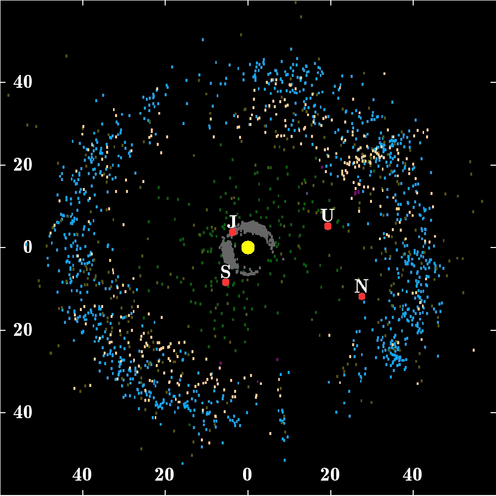 Серые — троянские астероиды Юпитера; зеленые — кентавры; оранжевые — рассеянный диск; голубые — пояс Эджворта-Койпера.