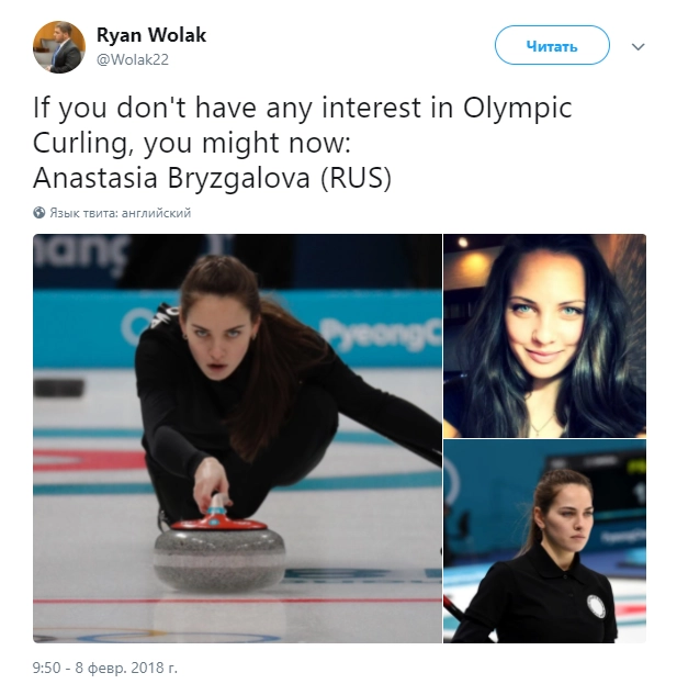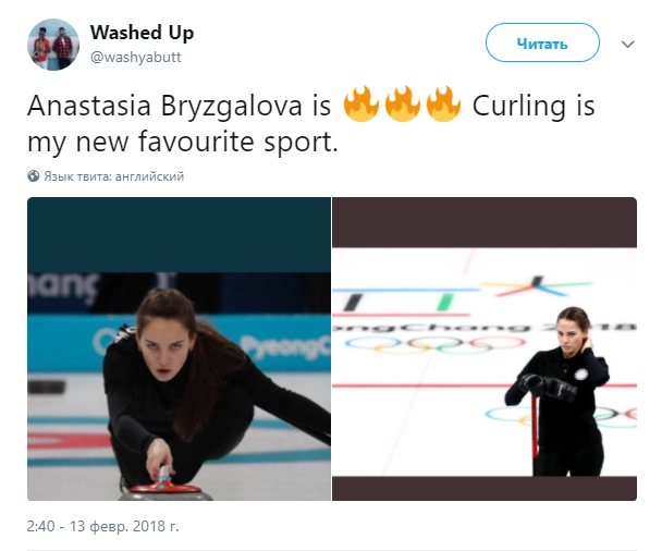 Огромную популярность в Twitter среди иностранных болельщиков завоевала российская керлингистка Анастасия Брызгалова, ставшая бронзовым призером Олимпиады в Пхёнчхане в паре со своим мужем Александром Крушельницким.