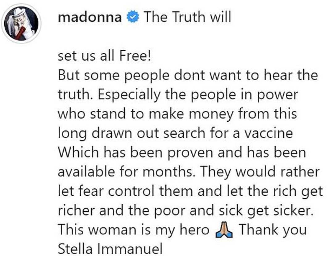 Правда сделает нас свободными! Но некоторые не хотят ее слышать. Особенно люди во власти, которые зарабатывают на «поисках вакцины», которая давно уже одобрена и доступна уже несколько месяцев, — заявила Мадонна.