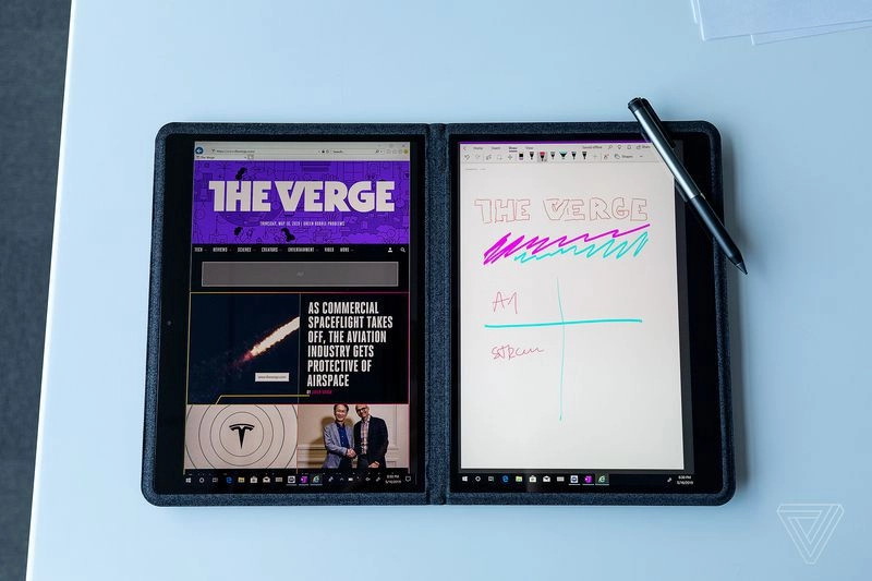 Устройство лишилось привычной физической клавиатуры. Вместо этого инженеры взяли два экрана на 12,3 дюйма разрешением 1920×1280 — и просто обернули их в композитную ткань.