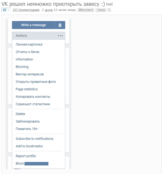 Кнопки «Вектор интересов», «Открыть приватные фото», «Копировать контакты», «Delete», «Заблокировать», «Пометить 18+" никуда не ведут, и лишь совершают действия. Последние три самые любопытные, но работают только по хешу, так что на других профилях не сработают (даже с авторизацией), отметил он.