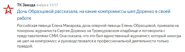 Пользователи соцсетей сообщили, что телеканал «Звезда» опубликовал материал с комментарием народной артистки СССР Елены Образцовой о смерти Сергея Доренко.