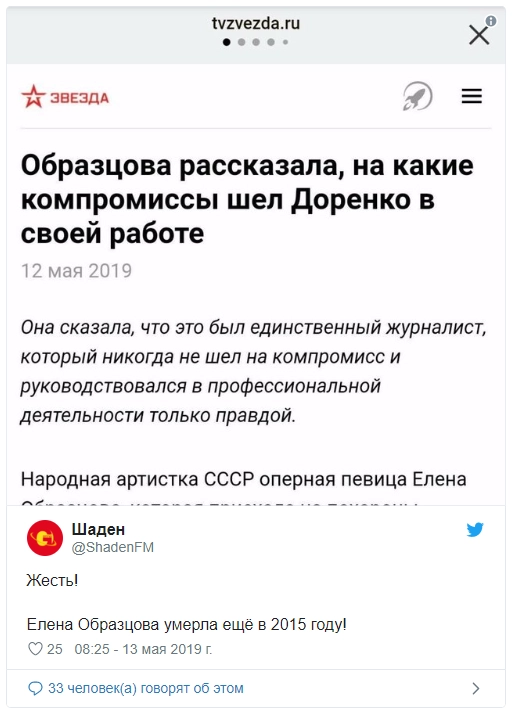 Артистка якобы приехала на похороны журналиста, которые не состоялись, и пообщалась с представителями СМИ. Однако Елена Образцова умерла 12 января 2015 года.