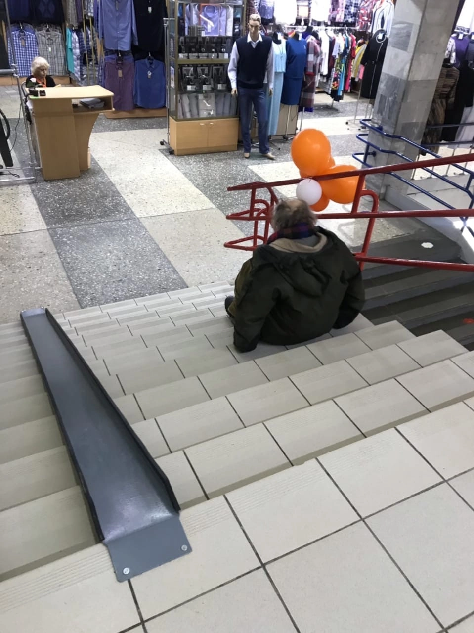 Инвалиду пришлось подниматься по лестнице торгового центра на руках