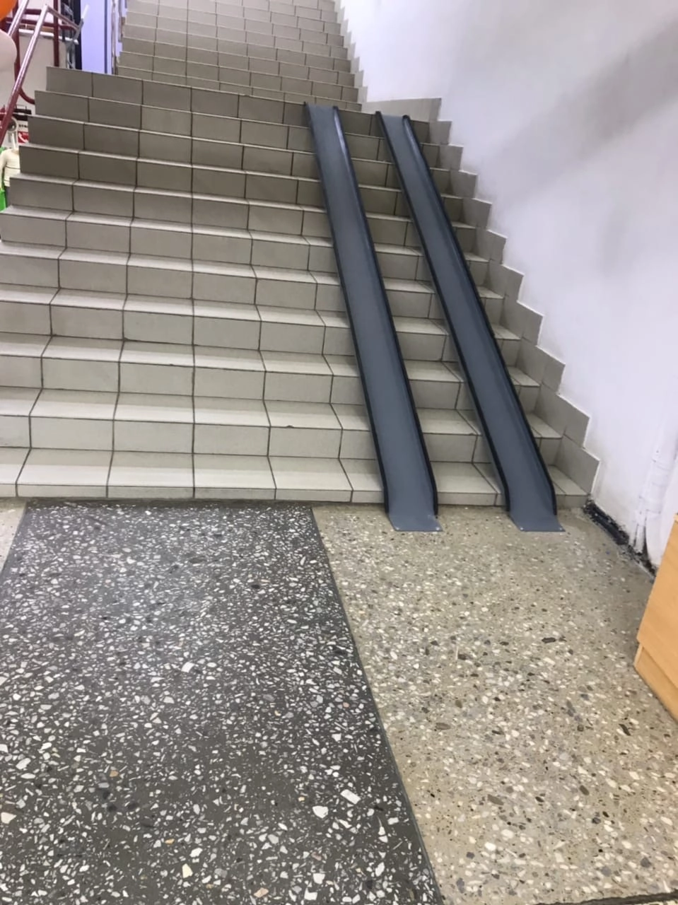 Мы давно знаем об этой проблеме. Но дело в том, что зданию уже 30 лет и его архитектура устроена так, что даже с пандусами и перилами человеку понадобится дополнительная помощь.