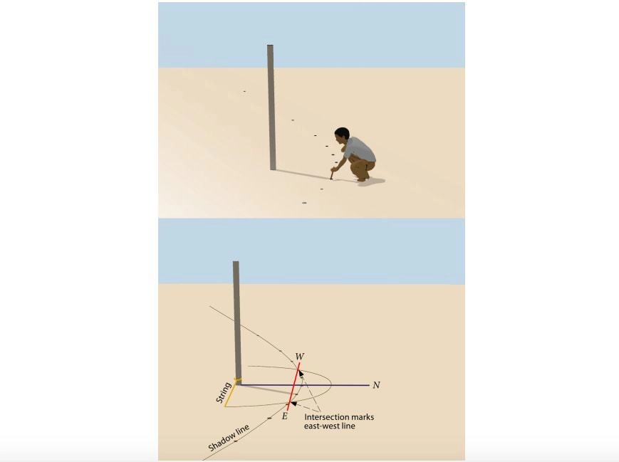 Соединив точки, получается полуокружность, а прямая, проходящая через нее, указывает на запад и восток. По словам Дэша, этот несложный метод можно сделать еще проще, если проводить наблюдения в день осеннего равноденствия. В этот день линия, проведенная через точки тени гномона, практически повторяет прямую, проведенную с запада на восток.