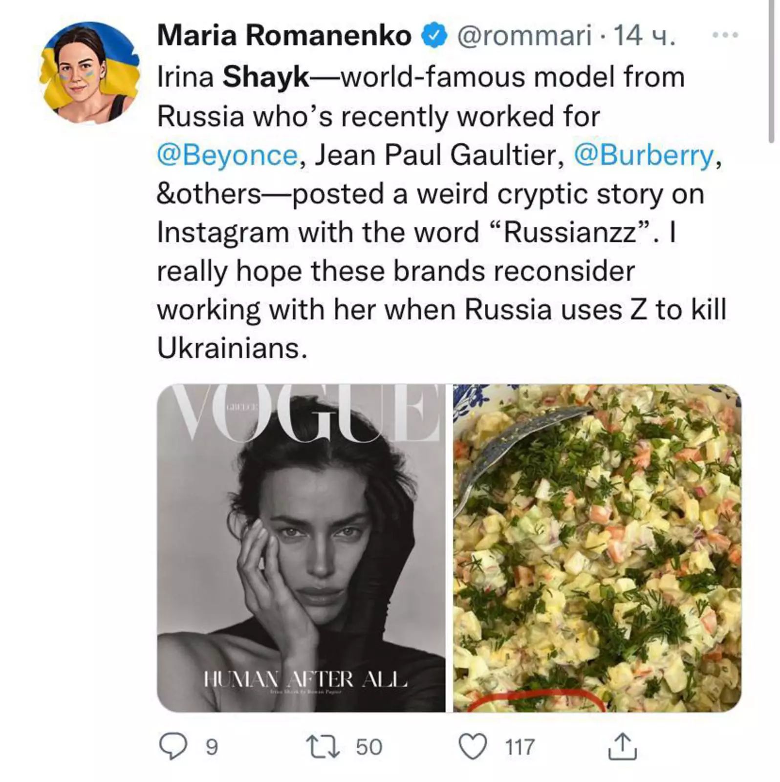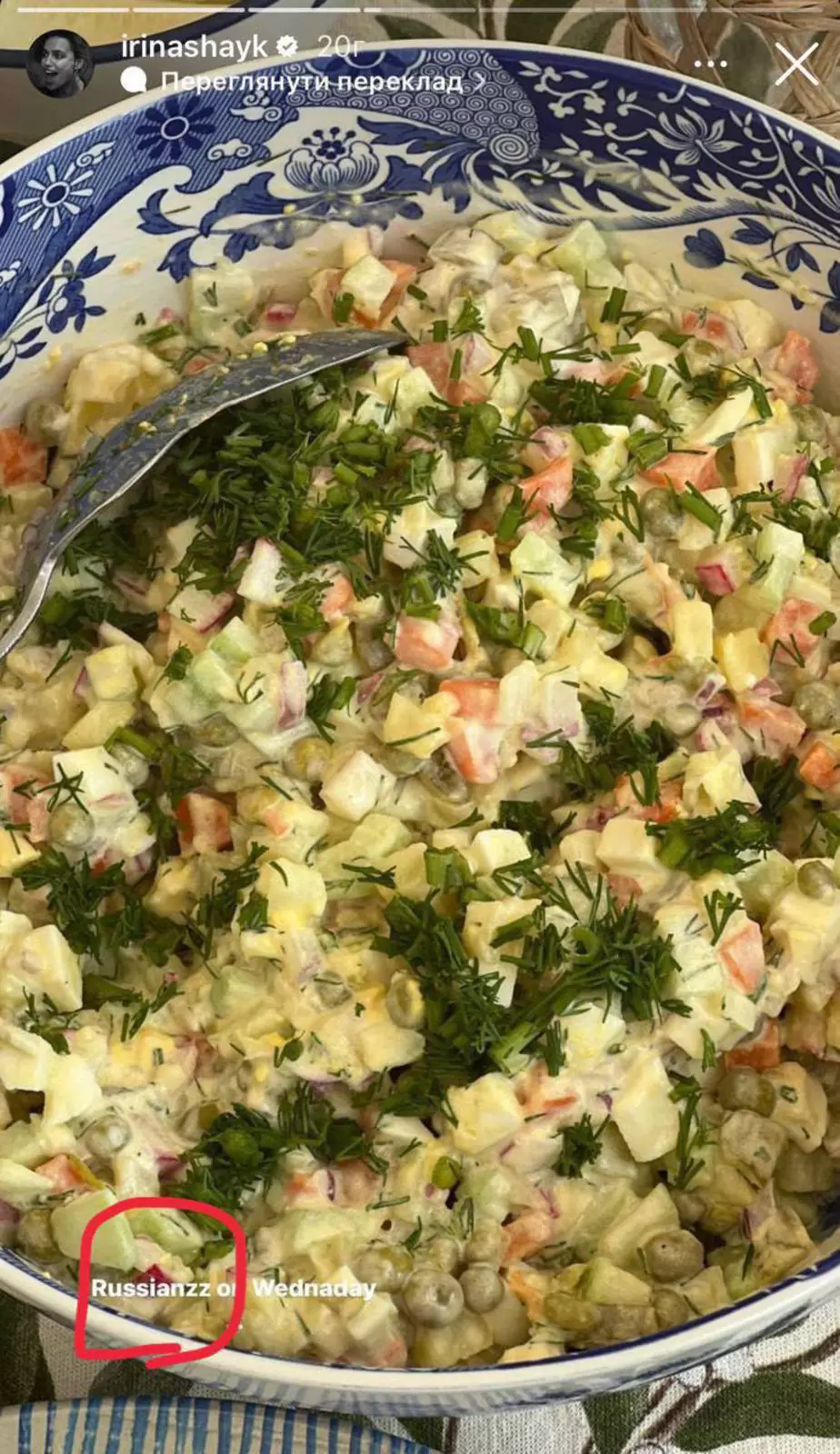 Как сообщает Telegram-канал «Беспощадный пиарщик», ранее Шейк (настоящее имя Ирина Шайхлисламова) опубликовала в своих сториз фотографию оливье, известного за рубежом как «русский салат». Фотографию она подписала как «Russianzz on Wednesday» («русский по средам»).