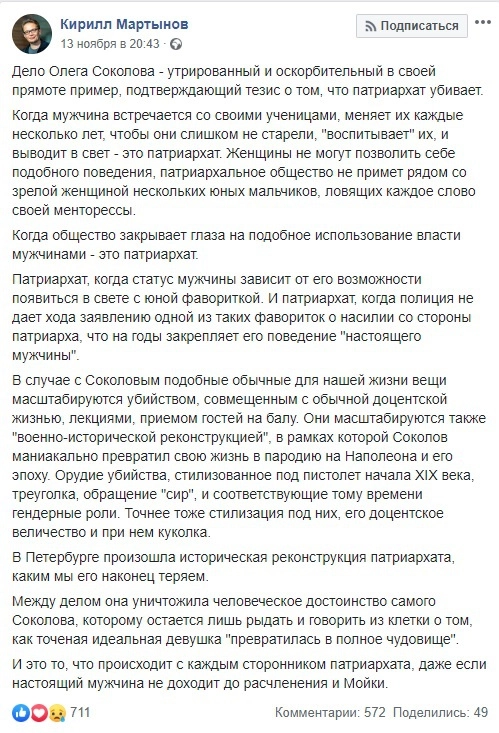 Бывший пресс-секретарь Росмолодежи, экс-координатор либерального клуба «Единой России», действующий редактор отдела политики «Новой газеты» и преподаватель философии НИУ ВШЭ Кирилл Мартынов на своей страничке в Facebook обвинил в случившемся с Анастасией Ещенко патриархальный порядок в обществе.