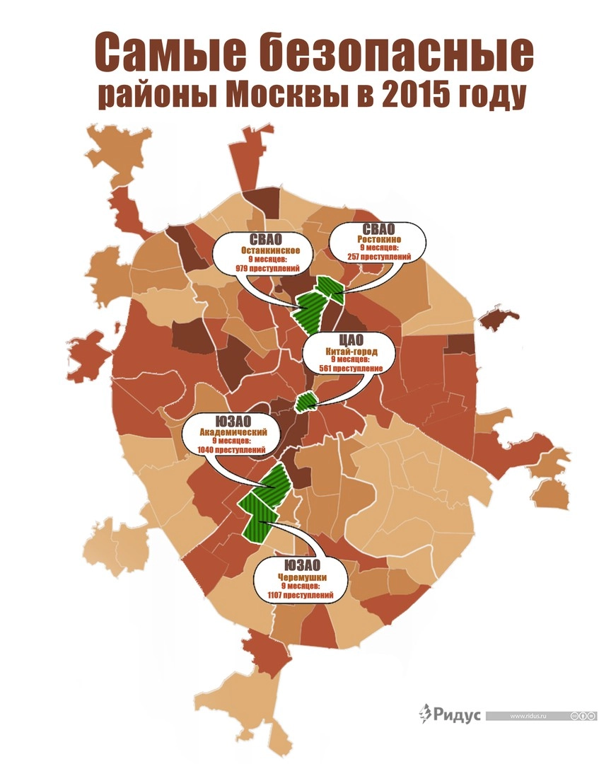 По версии «Ридуса», согласно данным полиции, самые безопасные районы в Москве — Китай-город (ЦАО) и Ростокино (СВАО), правда, в расчет не брались районы ТИНАО и Зеленограда.