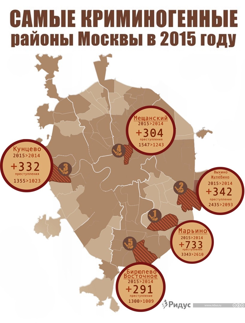 Не так давно десятки СМИ опубликовали составленный Urban Awards рейтинг округов Москвы с самым высоким уровнем криминала, а также наиболее безопасных районов столицы. Но, как выяснил «Ридус», исследовав статистику столичной полиции по итогам 9 месяцев 2015 года, указанные «риелтерами» данные не соответствуют действительности.
