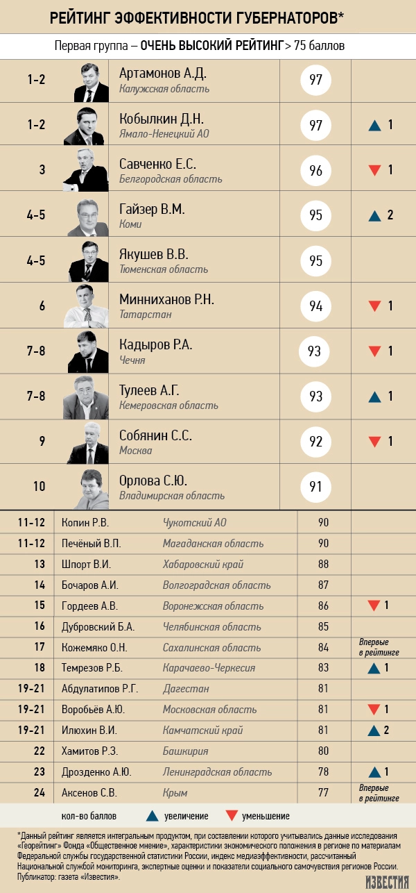 Добавим, что мэр Москвы Сергей Собянин занял 9 место, набрав 92 балла, а глава Санкт-Петербурга Георгий Полтавченко — поделил 26−27 места с руководителем Приморского края Владимиром Миклушевским, заработав 74 балла.