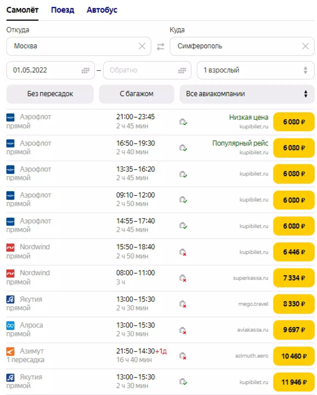 Тем временем российские авиаперевозчики продают билеты на начало мая на южные направления. Так, «Аэрофлот» официально предлагает на 1 мая билеты до Симферополя. Другие авиакомпании также не отстают.
