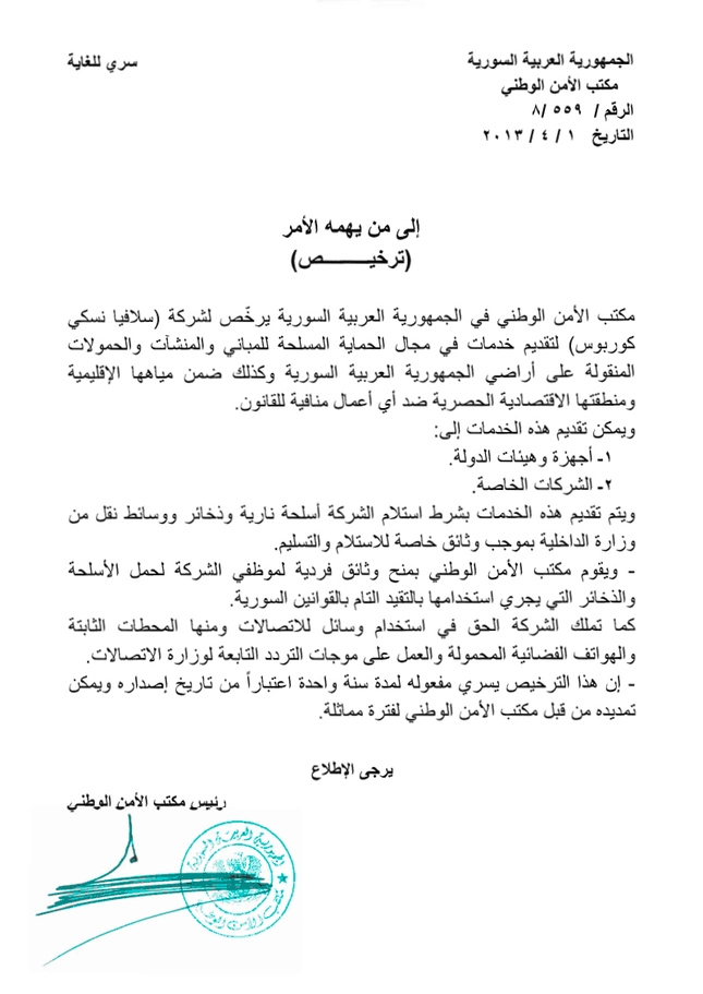 Компания подписала соглашение с Министерством электроэнергетики, в соответствии с которым должна была охранять инфраструктуры и персонал на объектах, включая ЛЭП, а также получила лицензию на охранную деятельность от Комитета национальной безопасности, в соответствии с которой имела право на получение вооружения от сирийского МВД и оказания вооруженных услуг на территории страны.