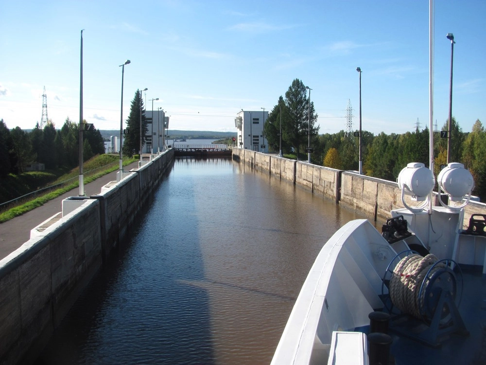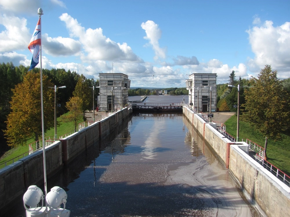 Белоусовский шлюз N2 остаётся позади, и теплоход выходит в Вытегорское водохранилище, образованное напорными сооружениями Вытегорского гидроузла, заключительного на трассе Волго-Балтийского канала перед спуском к Онежскому озеру.