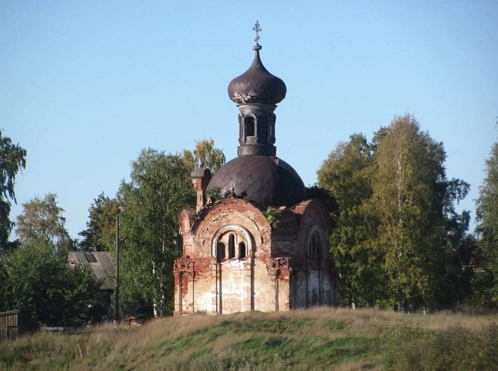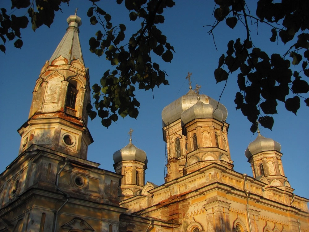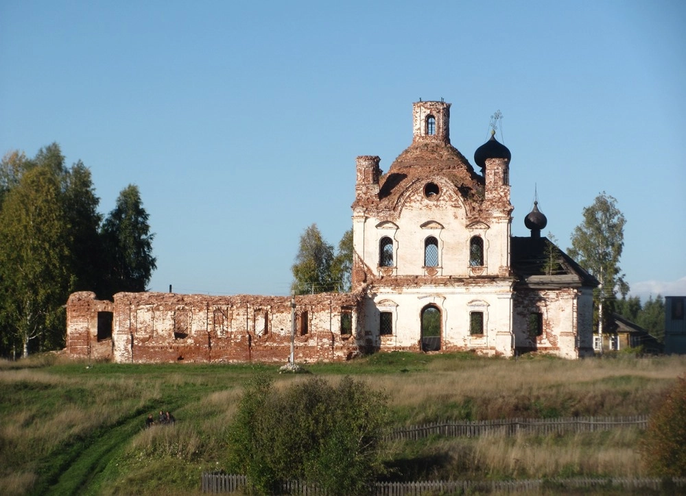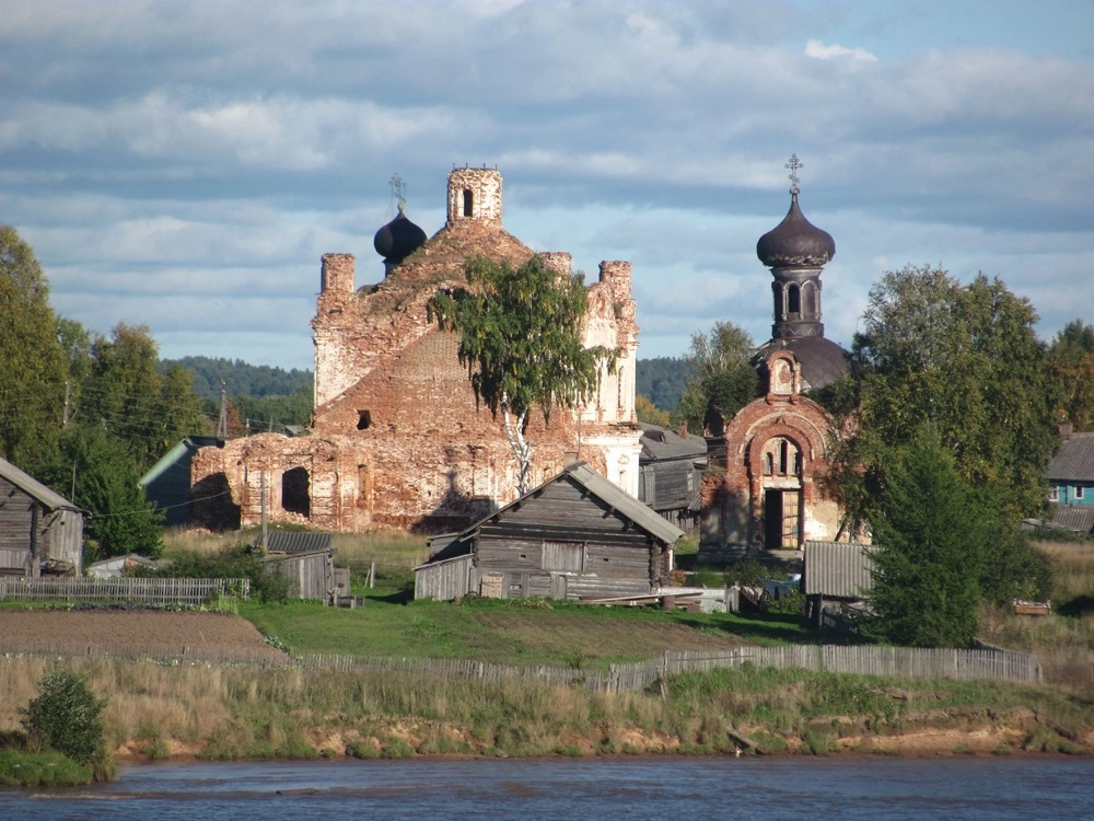 Полуразрушенные Спасская и Всехсвятская церкви в селе Анхимово.