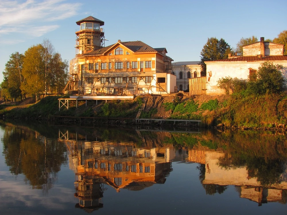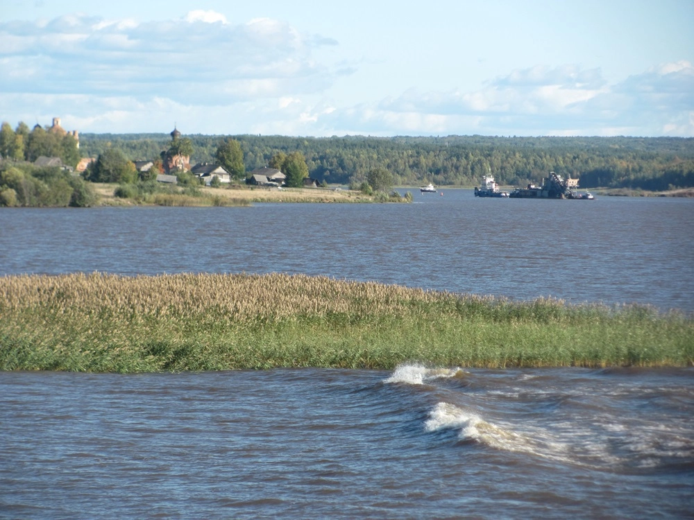 Вчера мы миновали Шекснинский гидроузел и стояли в посёлке Шексна, откуда съездили на экскурсию в Вологду. За ночь теплоход прошёл около 150 километров по Шекснинскому водохранилищу, пересёк крупное Белое озеро и в настоящее время движется по искусственному водораздельному участку трассы, проходящему по значительно расширенным, спрямлённым и углубленным руслам рек Ковжи и Вытегры и 40-километровому искусственному каналу между ними.