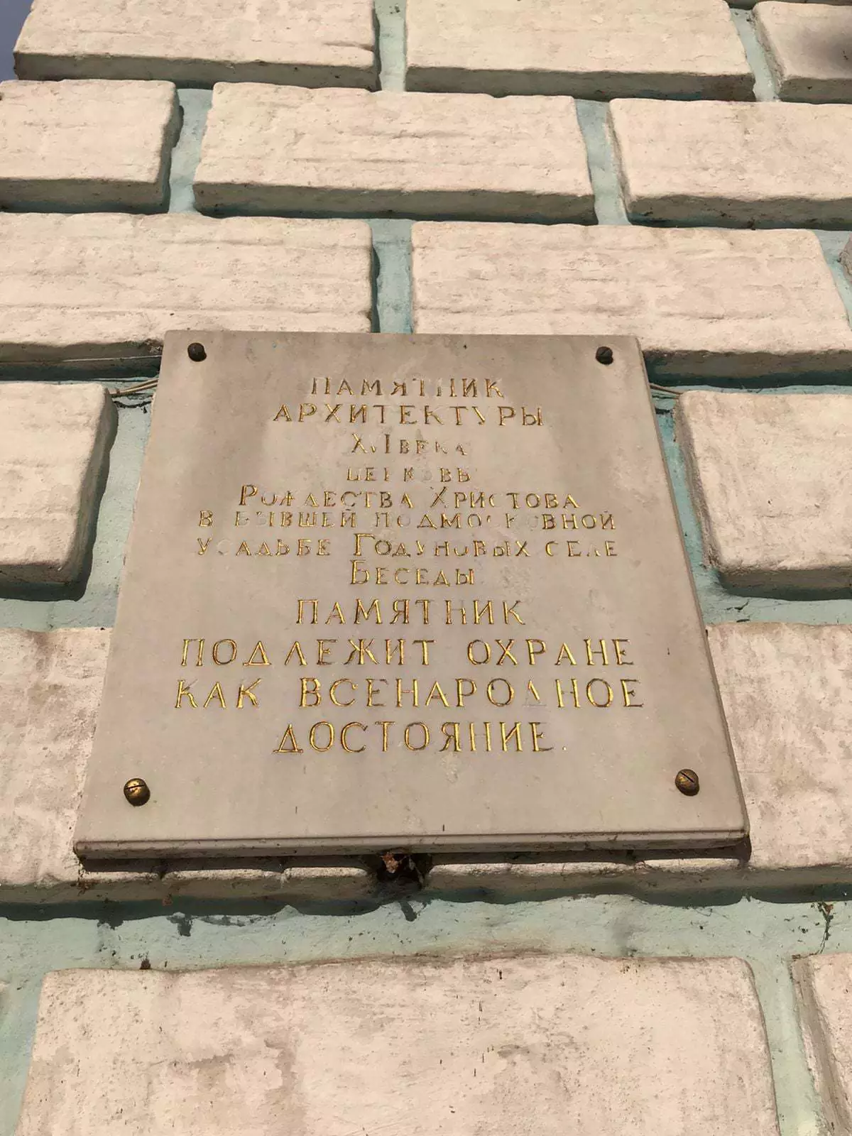 Храм Рождества Христова в подмосковном селе Беседы. Достоверно время появления первого храма на этом месте неизвестно. Сведения о нынешней церкви имеются с конца XVI века. Нынешняя каменная церковь была построена в 1598—1599 годах Годуновыми. Годуновы, будучи приближёнными царя, получали привилегии и богатые дары, в том числе лучшие подмосковные земли и поместья. Дмитрий Иванович Годунов получил село Беседы с прилежащими землями.