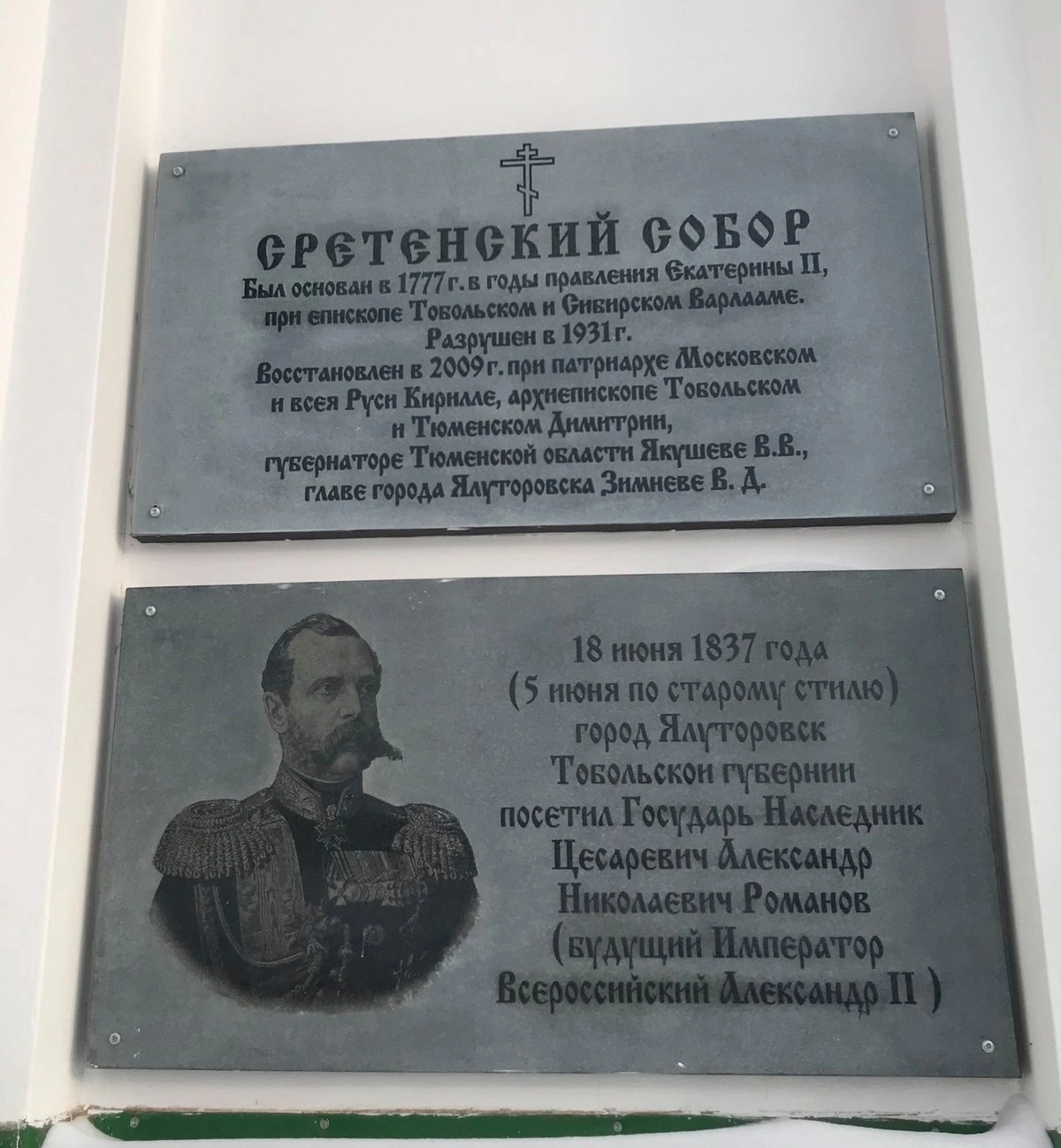 В 1837 году, во время визита в Ялуторовск, собор посещал будущий император Александр II. А в 1846 году тут венчался декабрист, соратник Пущина князь Евгений Оболенский с бывшей крепостной Варварой Барановой. В 1908 году собор был закрыт из-за появления трещин, которые пошли в результате ошибки при закладке фундамента. Ремонт шел медленно, собор открыли лишь перед Первой мировой войной.