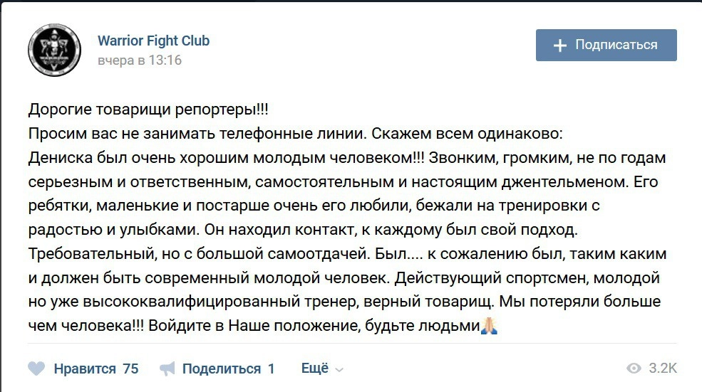Спасибо всем, кто не остался равнодушным и помог, дело пошло намного быстрее. Наши худшие опасения подтвердились. Вчера во время взрыва погиб наш друг, замечательный тренер и коллега Петров Денис Романович, такая публикация появилась вечером 4 апреля в паблике WFC.