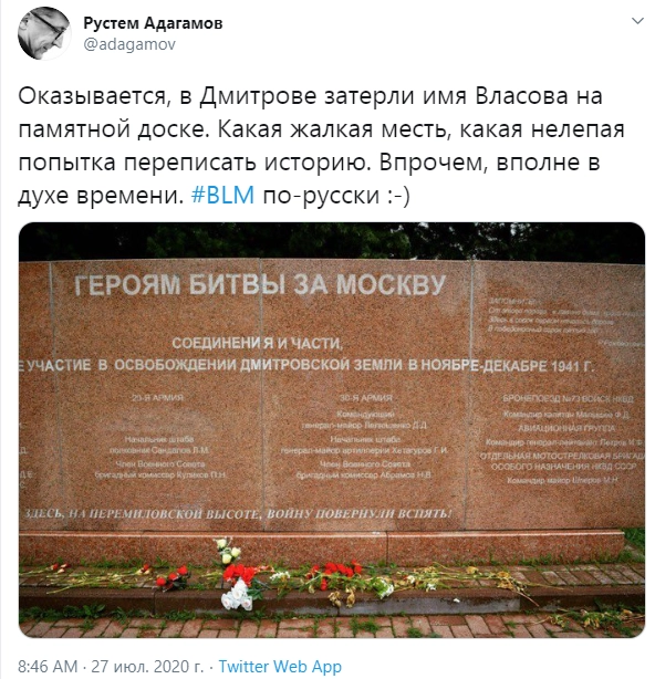Имя генерала-изменника оказалось на воздвигнутом в 2005 году мемориале, так как он участвовал в обороне столицы как командующий 20-й армией. Но в последние дни блогеры и пользователи соцсетей стали замечать, что оно исчезло с мемориальной доски. Блогер Кирилл Моисеев утверждает, что упоминание Андрея Власова было удалено с нее еще в мае 2020 года.