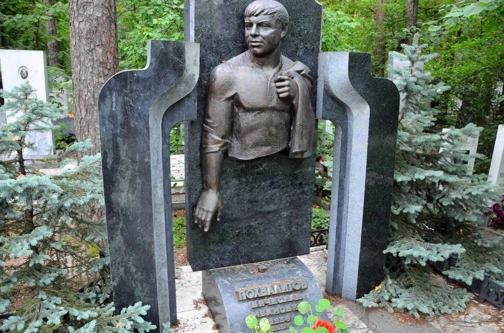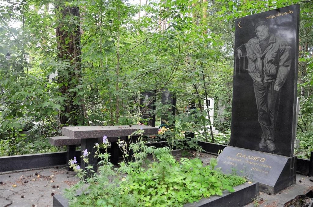 Фларит Валиев, другой авторитет «центровых», также убитый в бандитский разборках. Обратите внимание на мусульманский полумесяц на памятнике. В 1993 году во время одной из сходок «уралмашевских» и «центровых» в казино «Золотой пегас» началась стрельба с кучей трупов, одним из которых и был Валиев. До сих пор никто точно не знает, чья именно пуля убила этого господина.