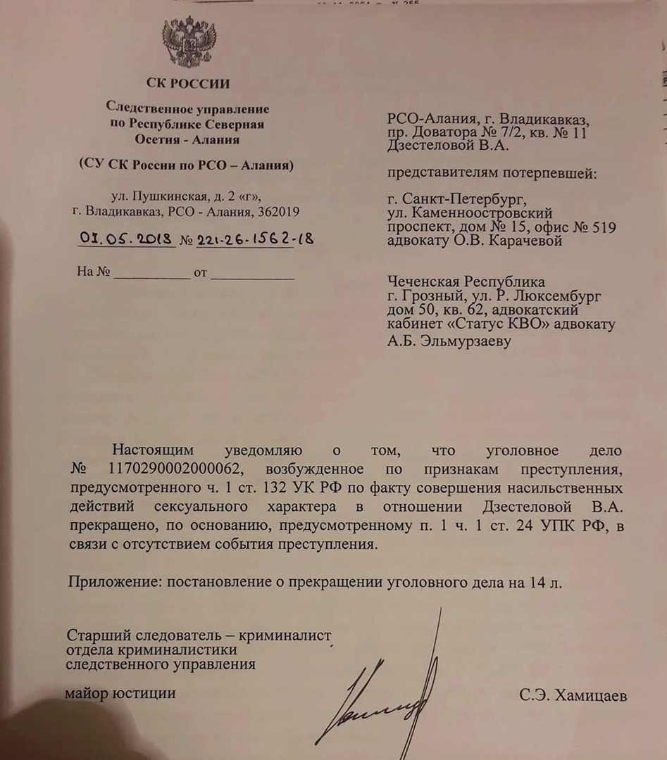 Как сообщила «Ридусу» адвокат пострадавшей Ольга Карачева, на данный момент производство по уголовному делу возобновлено и передано в ГСУ по СКФО.