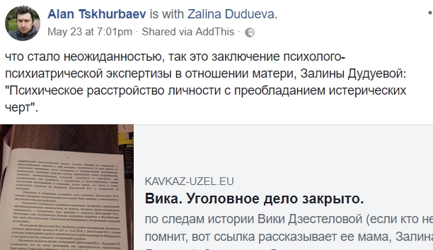 В сообщении Цхурбаева говорится, что и самой Залине Дудуевой был ранее неожиданно поставлен диагноз «психическое расстройство личности с преобладанием истерических черт».