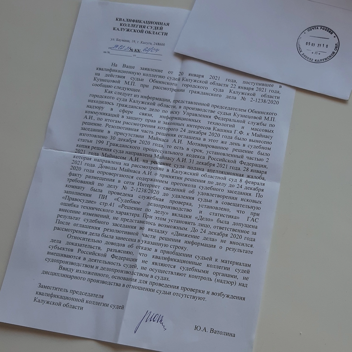 После этого он получил ответ из судебного департамента Калужской области. «Когда я нёс конверт домой, то думал, что там очередная унылая отписка. Но всё оказалось куда интереснее».