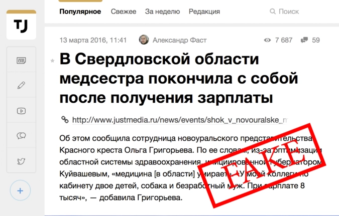 Напомним, информационно-аналитический портал JustMedia, специализирующийся на новостях Екатеринбурга и Свердловской области, взбудоражил блогеров, украинские и некоторые не самые надежные российские СМИ своей новостью о том, как медсестра из города Новоуральска покончила с собой из-за сокращения зарплаты.