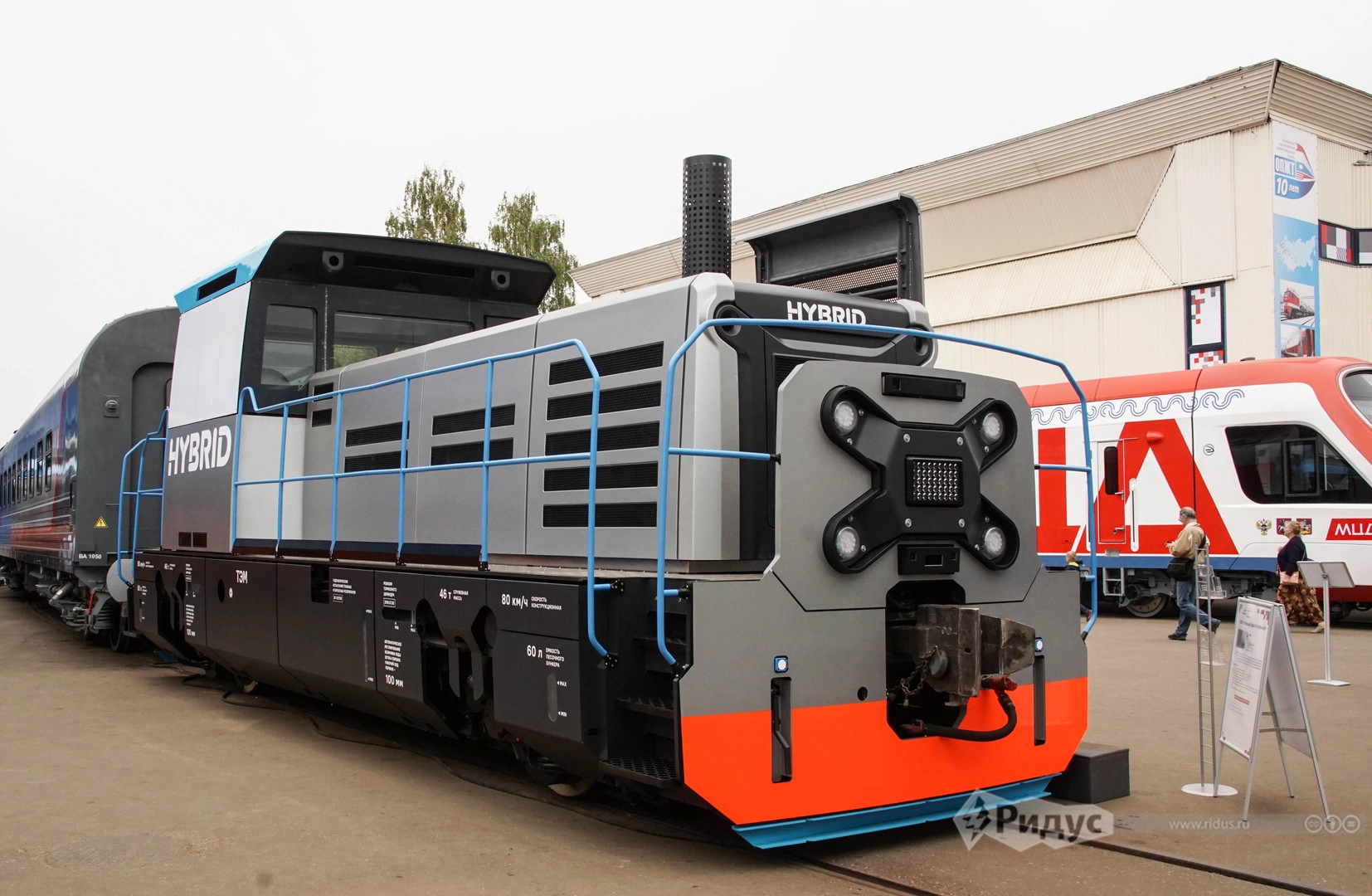 В противовес великану 2ЭС7 на выставке был представлен и небольшой концепт локомотива будущего — гибридного тепловоза ТЭМ5Х (200 кВт по дизелю) Машина оборудована литий-ионными тяговыми аккумуляторами, разработанными «Роснано». Вполне возможно, что такие локомотивы когда-то составят будущее железнодорожного транспорта (по крайней мере, в маневровой части), пока же при взгляде на него невольно возникают ассоциации с разрекламированным некогда «Ё-мобилем».