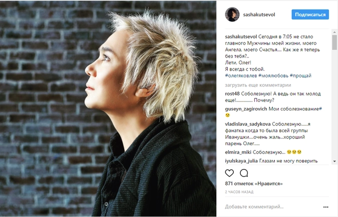 47-летний Олег Яковлев скончался от двухстороннего воспаления легких. Об этом его продюсер и гражданская жена Александра Куцевол сообщила в Instagram. «Сегодня в 7:05 не стало главного Мужчины моей жизни, моего Ангела, моего Счастья… Как же я теперь без тебя?.. Лети, Олег! Я всегда с тобой», — написала она.