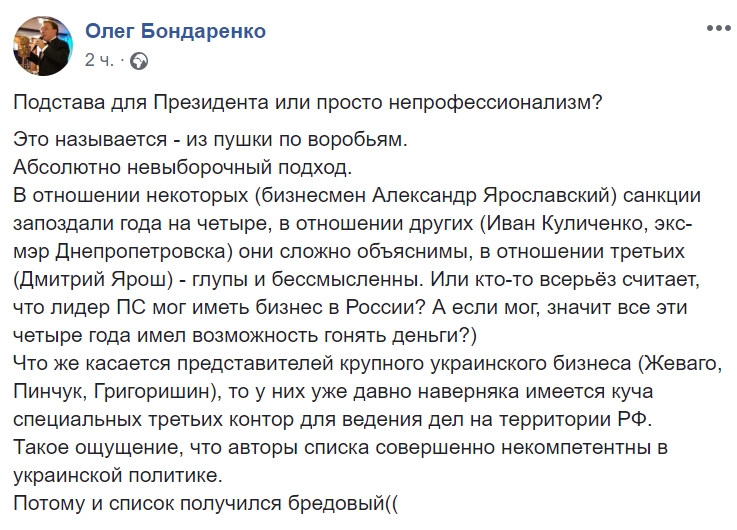 «С какого, простите, перепугу его нет в этих списках? Он что — друг России? Напомнить, как он оскорблял нашего президента? Напомнить, как финансировал нацистские батальоны „Днепр-1“ и „Днепр-2“? Напомнить, как он похищал людей и призывал к похищениям, обещая за это денежное вознаграждение», — пишет Долгов в авторской колонке для «Ридуса».
