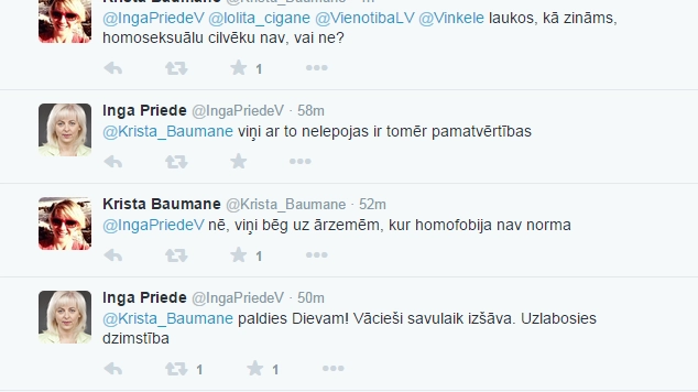 Далее Приеде написала, что в сельских районах люди с нетрадиционной сексуальной ориентацией «этим не гордятся, существуют всё-таки базовые ценности». А позже написала: «Слава Богу! Немцы в своё время отстрелили. Рождаемость улучшилась».
