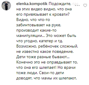 На видеозаписи инцидента можно разглядеть, как медицинская сестра входит в палату с ребенком и совершает движение, похожее на шлепок, а затем связывает лежащему на кровати малышу руки. Опубликовавшая видео в Instagram женщина утверждает, что ребенка избили и затем привязали к кровати.