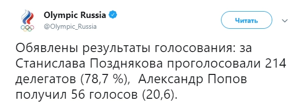 За него отдали свои голоса 214 делегатов (78,7%), а четырехкратный олимпийский чемпион по плаванию Александр Попов получил 56 голосов (20,6%), сообщается на странице организации в Twitter.