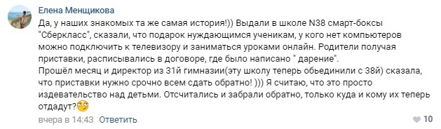 В школе выдали смарт-боксы (сберкласс), сказали, на бесплатной основе, все расписались, в дальнейшем надо рассчитываться за пользование, все похлопали в ладоши: «Ура, образование сдвинулось с места!» 10 раз спрашивали: «Возвращать ничего не нужно?» Школа ответила: «Это подарки для учебы». Отчитались. Теперь всем написали, чтобы вернули! — сообщила жительница города в группе «Инцидент|Курган» «ВКонтакте».