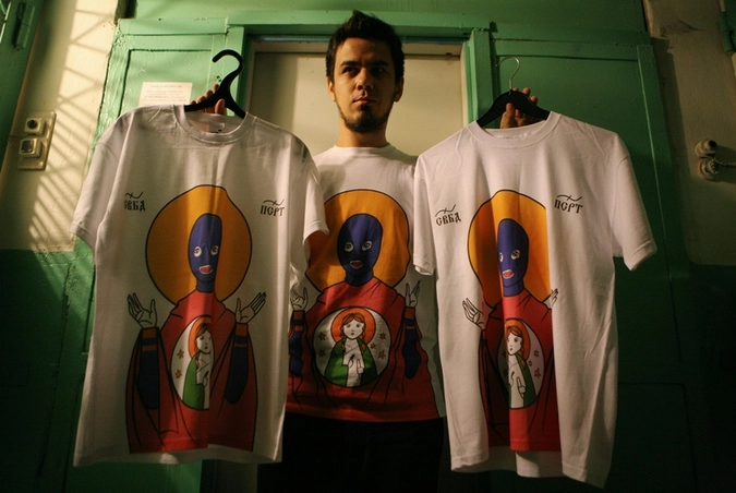 Молодой человек показывает футболки в стиле Pussy Riot © Александр Кряжев/РИА Новости