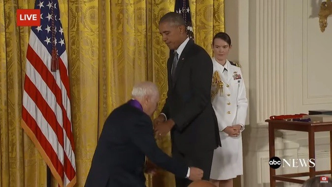 Получая награду из рук президента, Брукс присел, сделав вид, что снимает с президента брюки. Американский лидер отреагировал на шутку с юмором.