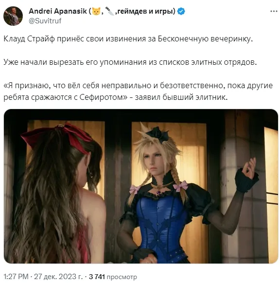 Среди «извинившихся селебрити» есть и вымышленные герои, например ведьмаки из одноименной фэнтезийной вселенной или Клауд Страйф из японской серии видеоигр Final Fantasy. Благо в фильмах и играх персонажи тоже нередко устраивают гулянки в нелепых костюмах.