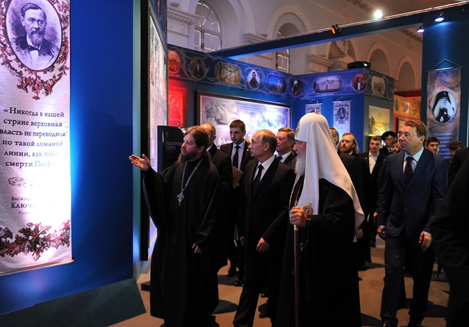 Президент России Владимир Путин и патриарх Московский и Всея Руси Кирилл во время осмотра интерактивной выставки "Православная Русь. Романовы", посвященной 400-летию императорской династии в московском Манеже. Справа - управляющий делами президента РФ Владимир Кожин. © Алексей Никольский/РИА Новости