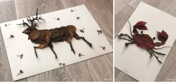Один из самых распространенных вариантов поделок в школу или детский сад — панно-гербарий. Чаще всего для него нужны лишь осенние листья, ветки, клей, картон или бумага. Обычно такие поделки просты в изготовлении, при этом выглядят необычно и создают осеннее настроение. Например, умельцы из Екатеринбурга выставили на продажу осеннего оленя и даже краба из листьев и веток.